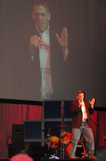 Lauren attended the General Sessions and learned and was inspired by many excellent speakers, including Governor Rick Perry. We both attended the evening sessions when the Exhibit Hall was closed. Lauren was excited to find another friend who had shown miniatures with her was in the Talent Show on Thursday night. Below are pictures of Jeff Jenkins performing his version of "Elvis". The theme of the Fun Night was Nerd Out 2006 and all had a great time.