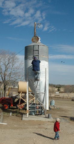 The driver had to climb a big ladder to the top of the feed bin to fill it.