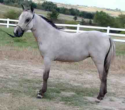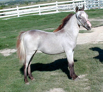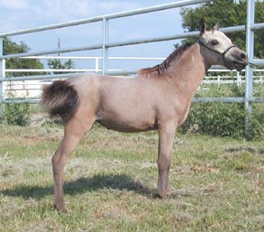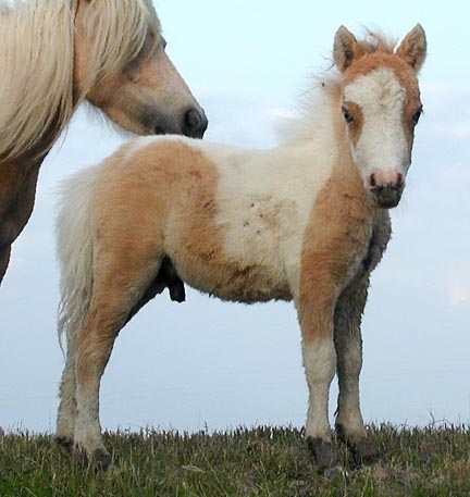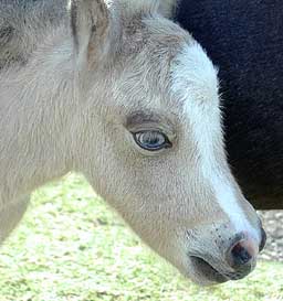 This spectacular bald-faced, blue-eyed stallion made his debut with foals in 2002. We have bred him to a wonderful group of palomino, sorrel, and buckskin mares. He is stamping them, wonderfully, and we find that they are a very special group of foals! Check our foals on a regular basis so that you won't miss that "special one" for yourself!
