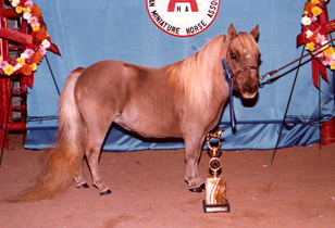People couldn't believe how tiny Tornado was after seeing him in person... they said his picture looked like a sixteen hand horse, but he was only 27" tall. His tornado shaped blaze set part of his name but his royal background did the rest. His sire's dam was a 31" daughter of the immortal show horse sire, Rowdy, and his dam, Crescent's Melodee (27 3/4") was our favorite showmare for years. She was a daughter of the National Grand Champion Senior Stallion, Crescent's 007 1/2 Moto.